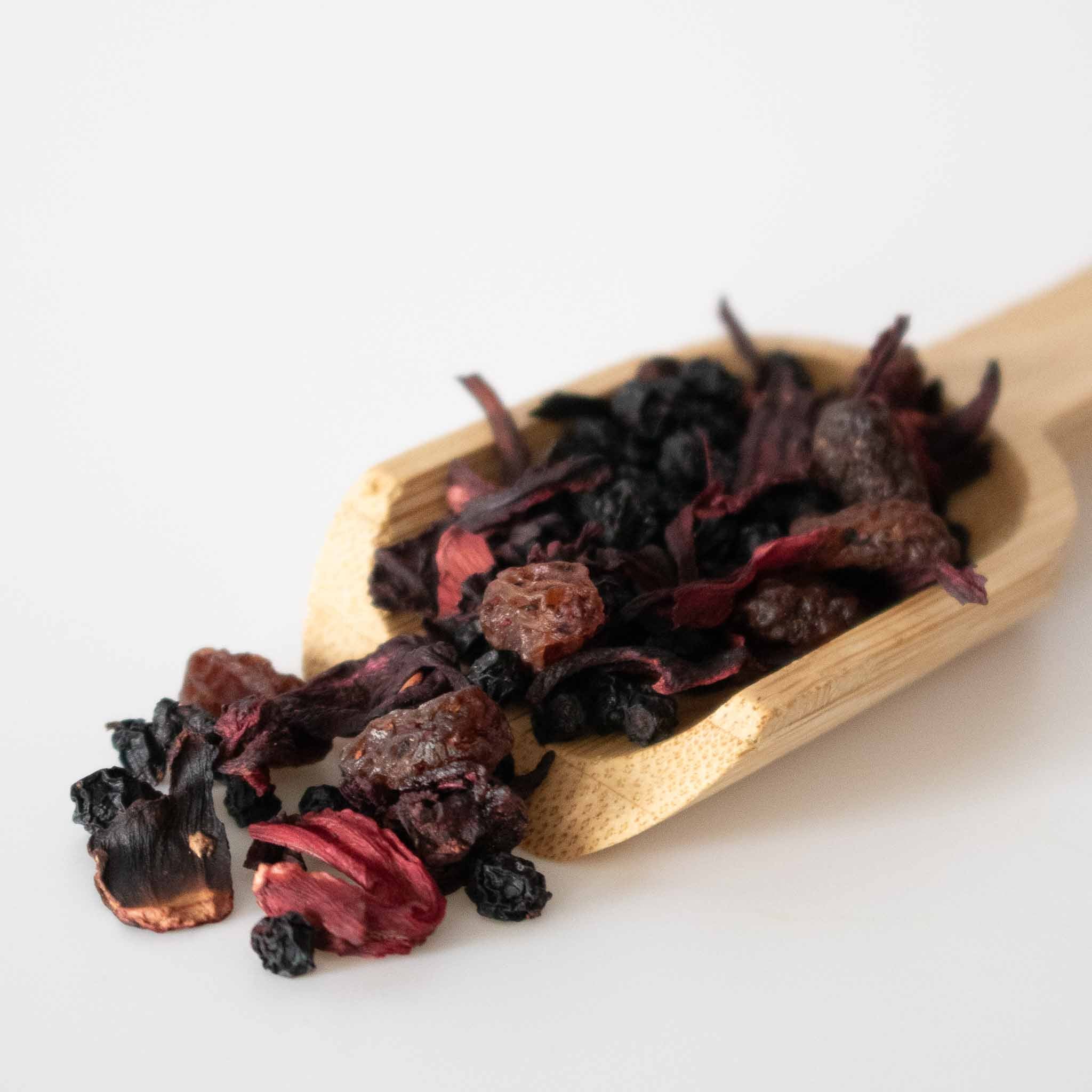 Ingredients: Elderberries, Grapes, Hibiscus Blossoms, Flavoring, Freeze-Dried Blackberries, Freeze-Dried Raspberry Pieces, Freeze-Dried Sour Cherry Pieces, Blackcurrants, Blueberries.