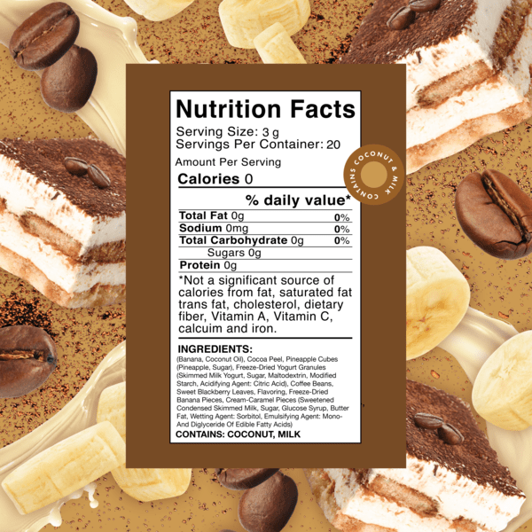 Ingredients: Apple Pieces, Banana Chips (Banana, Coconut Oil), Cocoa Peel, Pineapple Cubes (Pineapple, Sugar), Freeze-Dried Yogurt Granules (Skimmed Milk Yogurt, Sugar, Maltodextrin, Modified Starch, Acidifying Agent: Citric Acid), Coffee Beans, Sweet Blackberry Leaves, Flavoring, Freeze-Dried Banana Pieces, Cream-Caramel Pieces (Sweetened, Condensed Skimmed Milk, Sugar, Glucose Syrup, Butter Fat, Wetting Agent: Sorbitol, Emulsifying Agent: Mono and Diglyceride of Edible Fatty Acids).