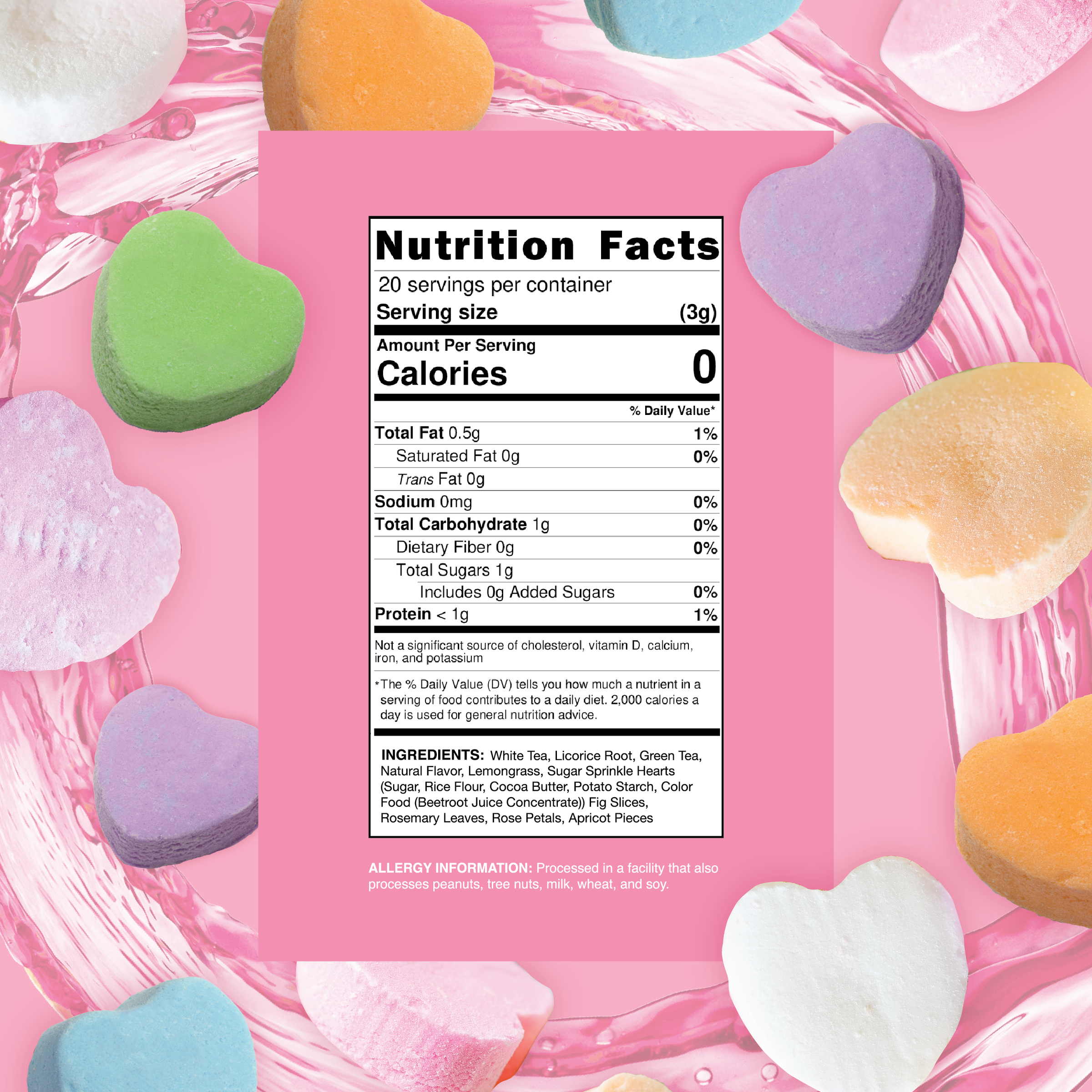 This blend is playful,Ā colorful, and impossible not to love.Ā With a delicate base of white and green tea, it's kissed with sugared heart sprinkles, juicy apricot, and fig.Ā Rose petals and rosemary add a touch of romance and intrigue.