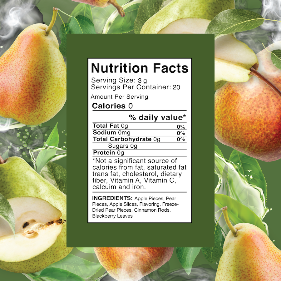 Ingredients: Apple Pieces, Pear Pieces, Apple Slices, Flavoring, Freeze-Dried Pear Pieces, Cinnamon Rods, Blackberry Leaves.