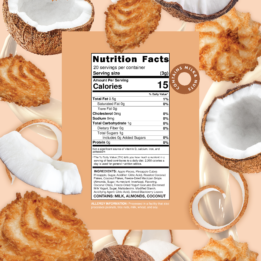 Ingredients: Apple Pieces, Pineapple Cubes (Pineapple, Sugar), Roasted Coconut Flakes, Coconut Flakes, Freeze-Dried Marzipan Drops (Almonds, Sugar, Humectant: Invertase), Flavoring, Coconut Chips, Freeze-Dried Yogurt Granules (Skimmed Milk Yogurt, Sugar, Maltodextrin, Modified Starch, Acidifying Agent: Citric Acid), Sweet Blackberry Leaves.