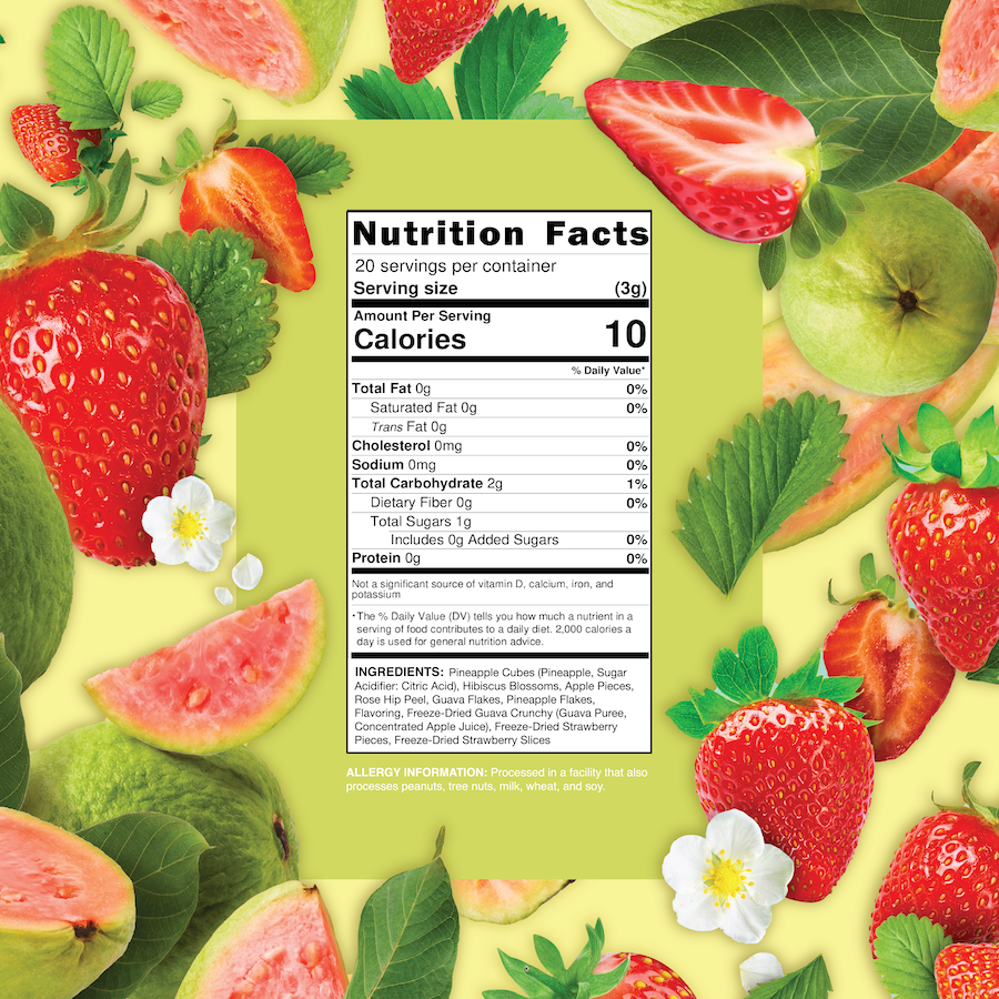 Ingredients: Pineapple Cubes (Pineapple, Sugar), Hibiscus Blossoms, Apple Pieces, Rose Hip Peel, Guava Flakes, Pineapple Flakes, Flavoring, Freeze-Dried Guava Crunchy (Guava Puree, Concentrated Apple Juice), Freeze-Dried Strawberry Pieces, Freeze-Dried Strawberry Slices