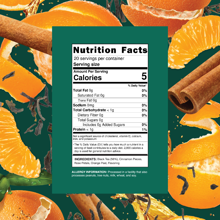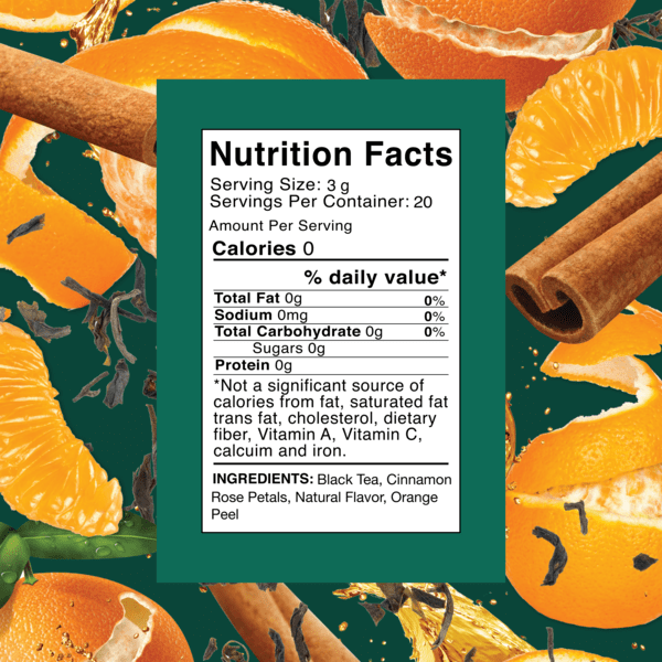 Ingredients: Black Tea, Cinnamon, Rose Petals, Natural Flavor, Orange Peel.