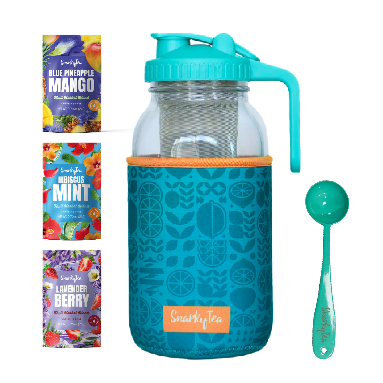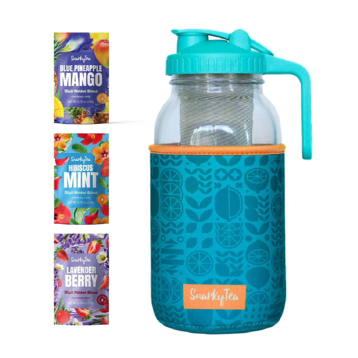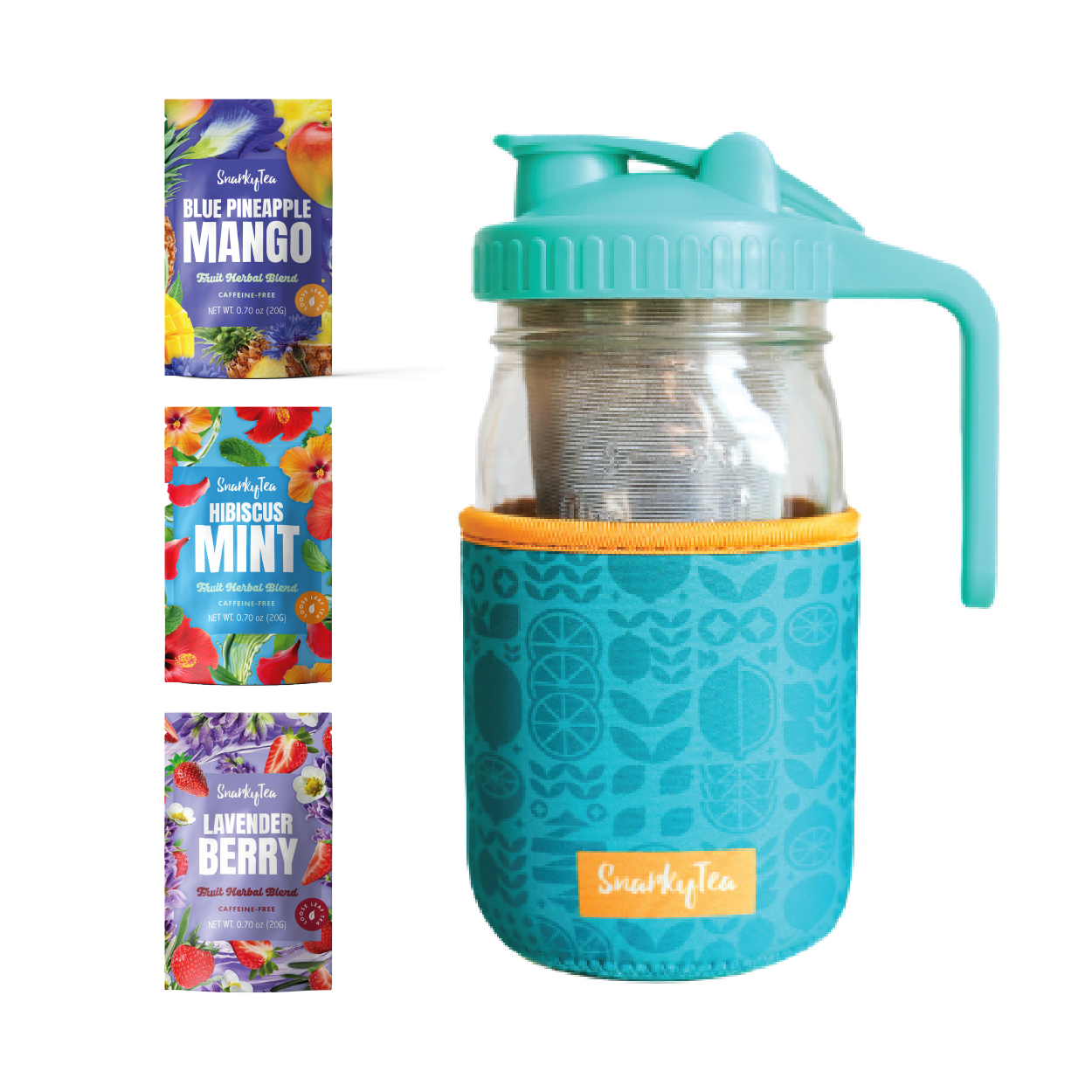 The Starter Kit: Includes 1 CHILL Filter, 1 Glass Mason Jar, 1 Signature Pouring Lid, 1 Neoprene Sleeve, a FREE tea sampler of your choice. Choose from: